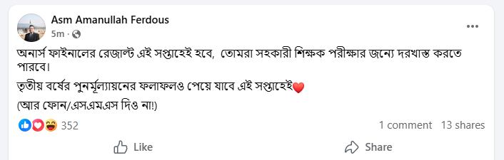 উপাচর্য তাঁর পোস্টে সরাসরি উল্লেখ করেন, “অনার্স ফাইনালের রেজাল্ট এই সপ্তাহেই হবে, তোমরা সহকারী শিক্ষক পরীক্ষার জন্যে দরখাস্ত করতে পারবে।”